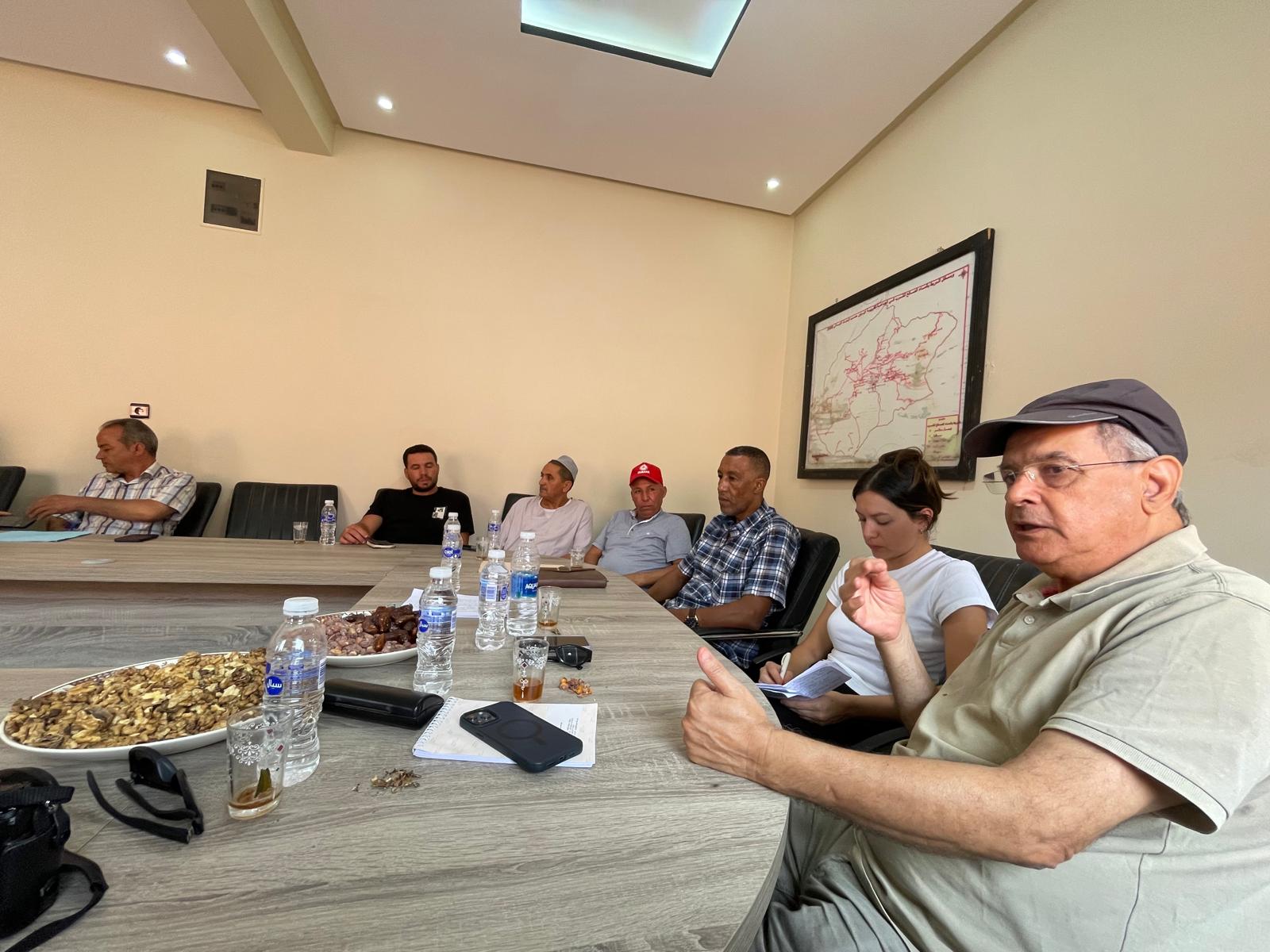 Les équipes ont commencé par une visite de terrain de la commune de l’Ouneine où elles ont pu rencontrer les associations locales et faire le bilan des activités déjà réalisées et/ou prévues, en partenariat avec Targa-Aide. Des problèmes persistants liés au stress hydrique ont été décelés lors des diagnostics préalables, donnant lieu à deux projets : la réhabilitation et l’extension du système d’assainissement du douar Toug El Kheir ; et le réaménagement de la rigole principale pour améliorer le système d’irrigation d’Adouz. Une visite complète du foyer féminin a également été effectuée, permettant aux différentes parties de réfléchir à sa reconstruction, mais également à la future gestion du foyer une fois terminé pour garantir sa pérennité, au vu de son importance pour développer le tissu associatif local et les initiatives féminines.
