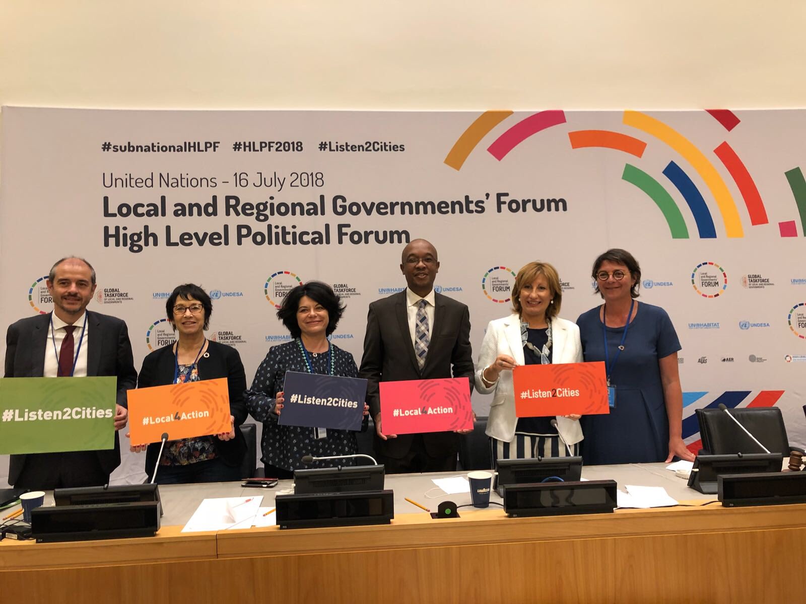 Liliane Lucchesi, Conseillère régionale déléguée de la Région Bourgogne-Franche-Comté, André Viola, Président, et Valérie Dumontet, Vice-Présidente du Conseil Départemental de l’Aude, aux côtés de Parks Tau, Président, et Emilia Saiz, Secrétaire générale de CGLU.