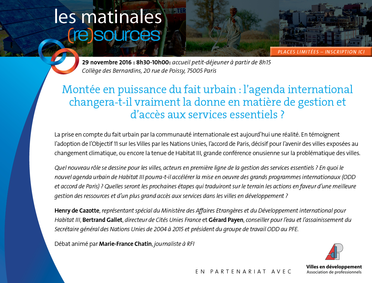 Le think tank (Re)sources organise sa prochaine Matinale intitulée : « Montée en puissance du fait urbain : l’agenda international changera-t-il vraiment la donne en matière de gestion et d’accès aux services essentiels ? » - mardi 29 novembre - 8h30-10h00 - Collège des Bernardins - 20, rue de Poissy - 75005 Paris.