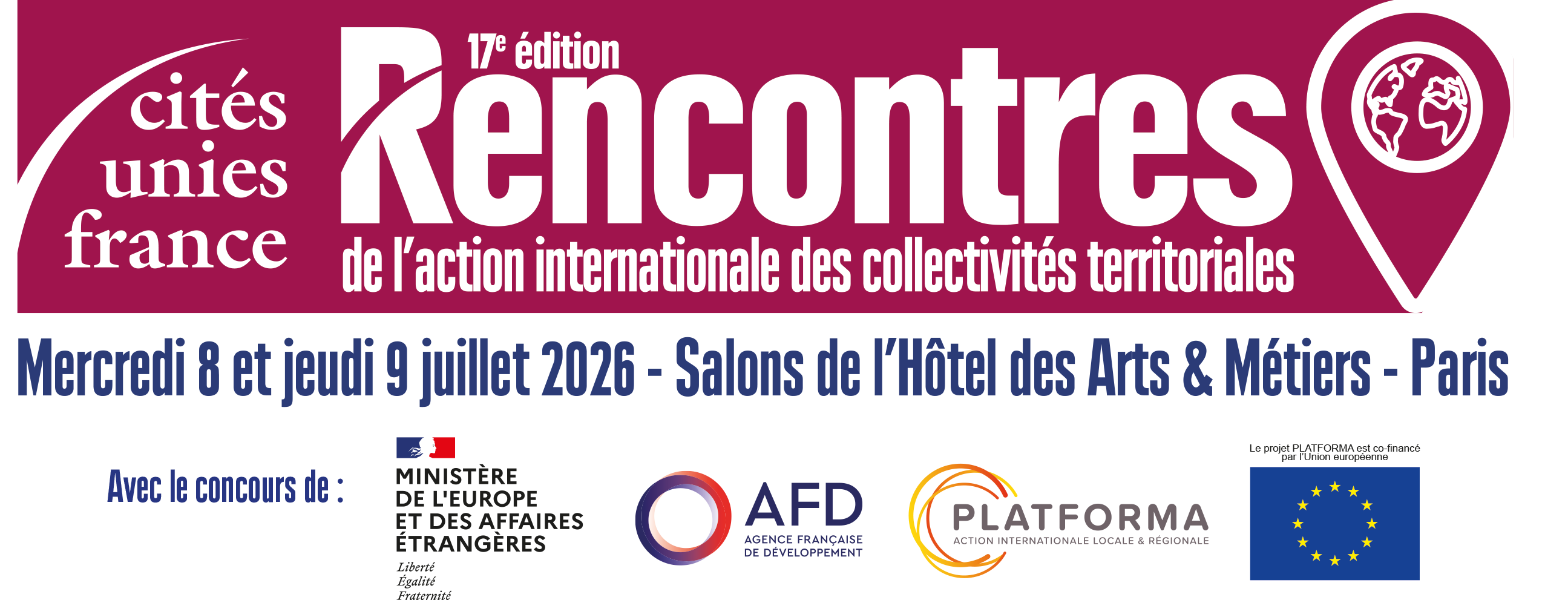 la 17e édition des « Rencontres de l’action internationale des collectivités territoriales » aura lieu les mercredi 8 et jeudi 9 juillet 2026, aux Salons de l’Hôtel des Arts et Métiers, 9bis Avenue d’Iéna – 75116 Paris.